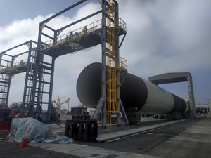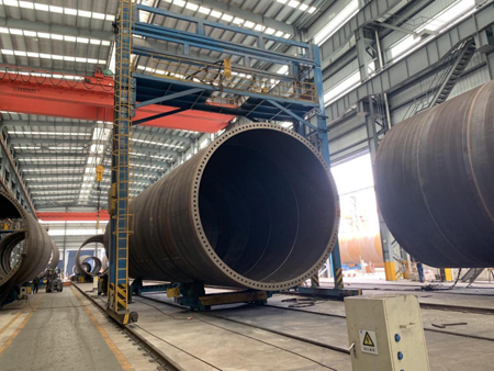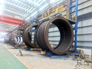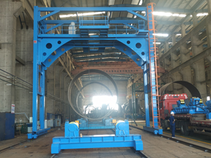 The welding of the flange and the cylinder section generally adopts the submerged arc welding method of matching the welding operator and the inclined roller frame. Inclined roller frames generally adopt 10T or 20T adjustable type (self adjustable type can be selected for small thin-walled cylinders). According to actual needs, hydraulic pressure can be used to turn the roller frame or directly fix the roller frame on a support frame with a certain angle (the angle of the fixed support can be determined according to the requirements of the welding process, commonly including 22 °, 45 °, etc.), to ensure that the welding seam is always welded in the boat welding mode. The rotation speed of the roller is controlled by frequency conversion, which ensures smooth starting and stopping. Welding allows convenient adjustment of the rotation speed of the cylinder. The welding operation frame is selected according to the diameter of the cylinder, and generally adopts a structure of high column and short cross arm.