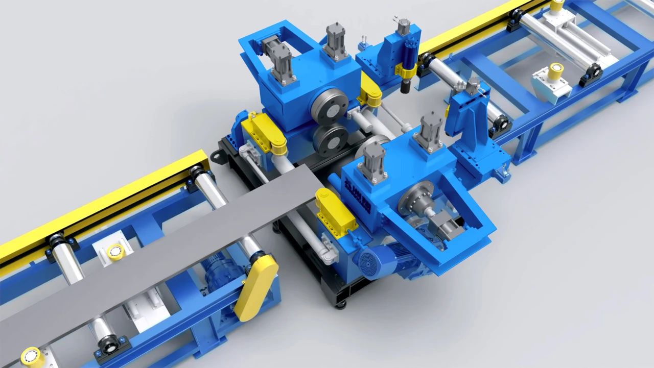 The all-in-one assembly and welding machine uses digital intelligent automation technology to accurately transport the panels, webs and other components of the T-shaped bar to the assembly position. It also uses auxiliary equipment such as positioning devices and pressing devices to ensure the precise alignment and firm combination of each component during the assembly process, and finally starts welding. The equipment consists of an input roller line, a T-profile assembly machine, an output roller line, an RGV removal trolley, a bracket, a hydraulic system, an electric control system and a welding power supply. Both T-profiles with center and offset webs can be assembled and welded.