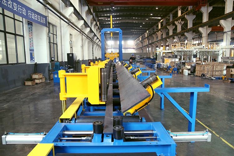 T-profile straightening machine is an industrial equipment specially used to eliminate the processing deformation of T-profiles in the manufacturing fields of bridges, ships, etc. It is an indispensable key equipment to ensure the manufacturing accuracy and product quality of T-profiles. The upper arch, lower bend, side bend, and curve of the profile are precisely adjusted through hydraulic or mechanical pressure wheels. The production line consists of an input roller line, a T-beam straightening machine, an output roller line, a wave pressure system, and an electronic control system. It is widely used in ship assembly lines.