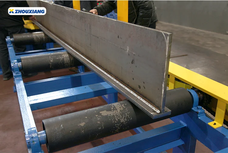 The equipment uses digital intelligent automation technology to accurately transport the panels, webs and other components of the T-profile to the assembly position, and uses auxiliary equipment such as positioning devices and clamping devices to ensure the precise alignment and firm combination of each component during the assembly process, and finally starts welding. The equipment consists of an input roller conveyor, aT-beam assembly machine,an output roller conveyor, an RGV removal trolley, a bracket, a hydraulic system, an electric control system and a welding power supply. Both the central and offset T-beams of the web can be assembled and welded.