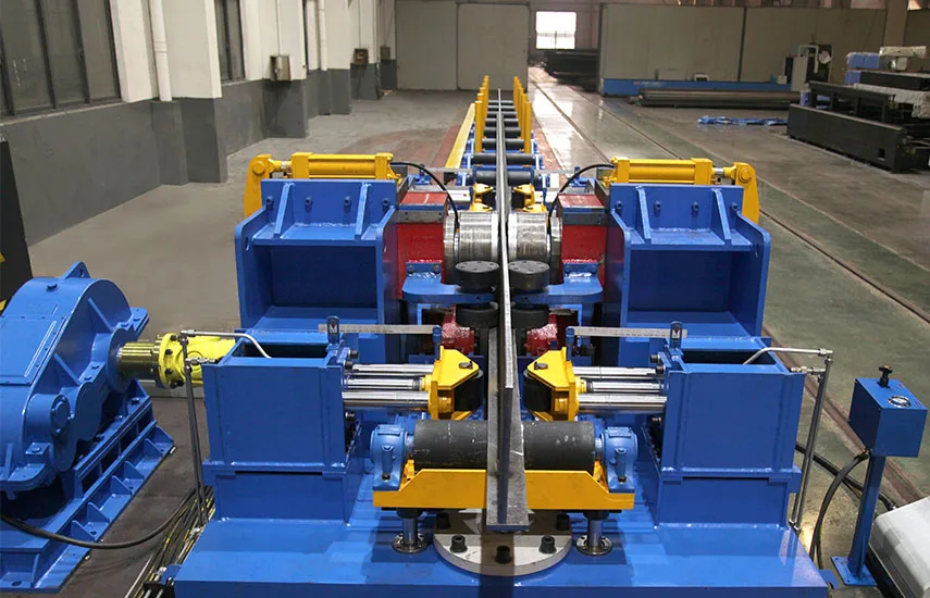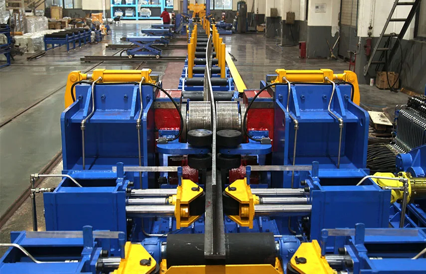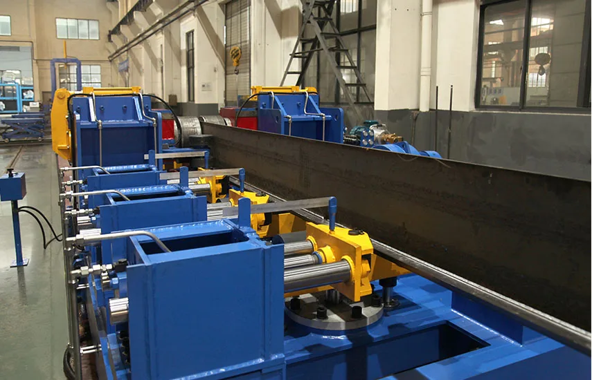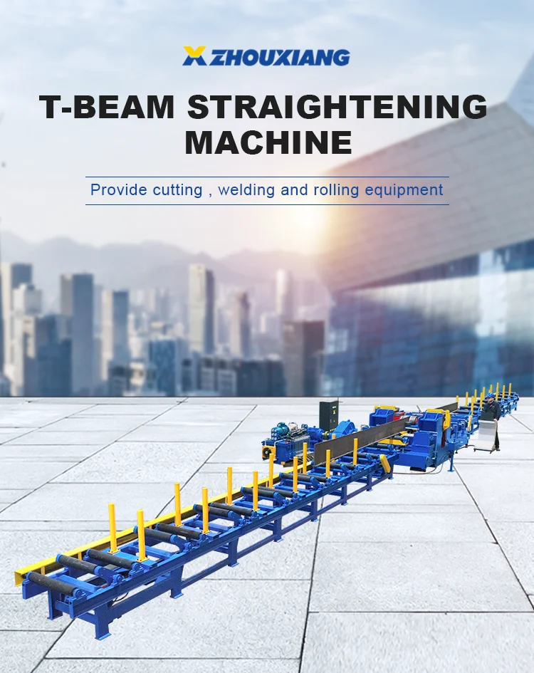The T-beam Straightening Machine is an industrial device specifically designed to eliminate deformations in Tbeams during processing in fields such as bridge and shipbuilding. It is an indispensable key equipment for ensuring the manufacturing precision and product quality of T-beams. It uses hydraulic or mechanical pressure rollers to accurately adjust the upward arch, downward bend, side bend, and warping of the profiles. The production line consists of an input roller line, T-beam straightening machine, output roller line, hydraulic system, and electrical control system. It is widely used in ship assembly lines.
